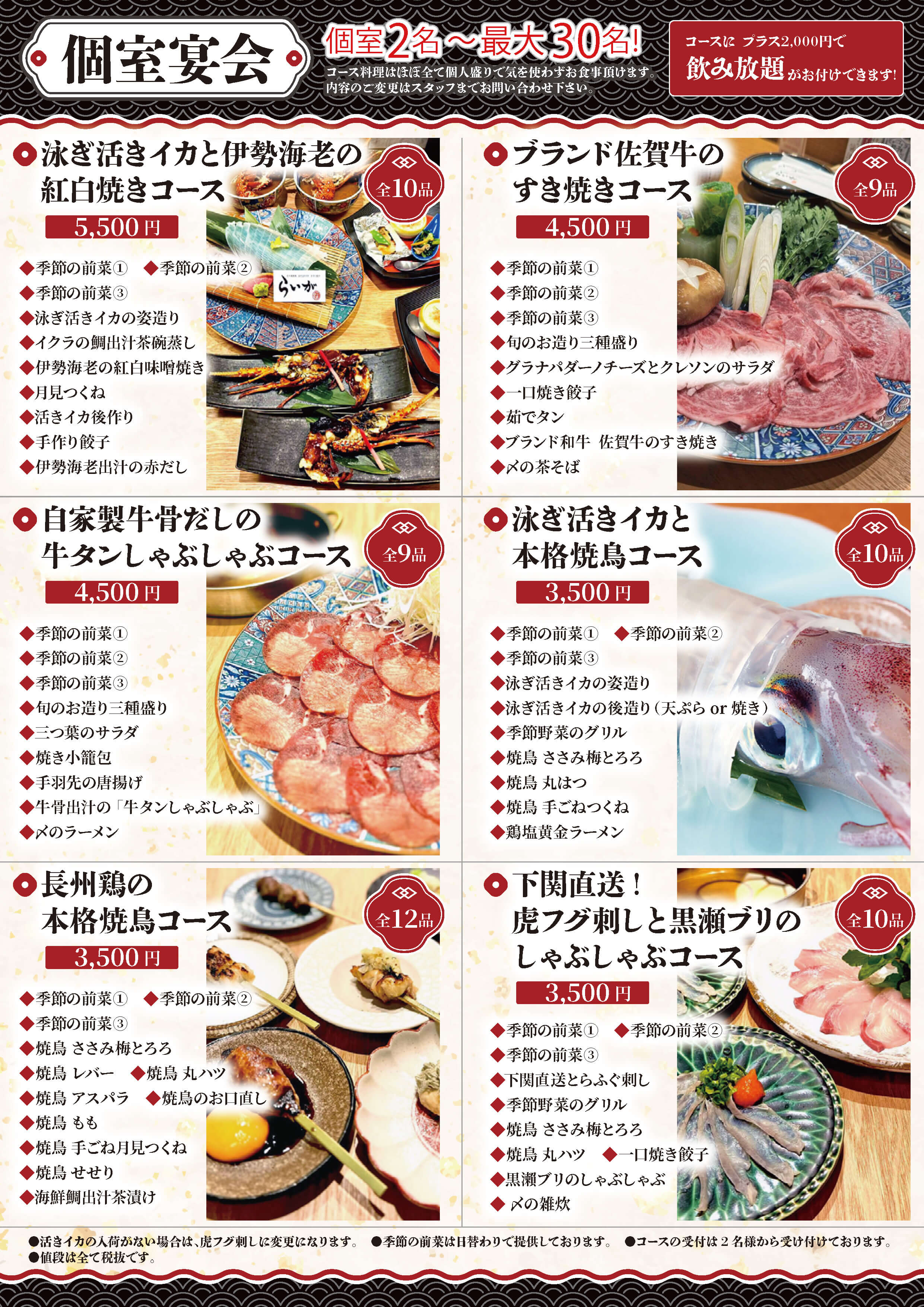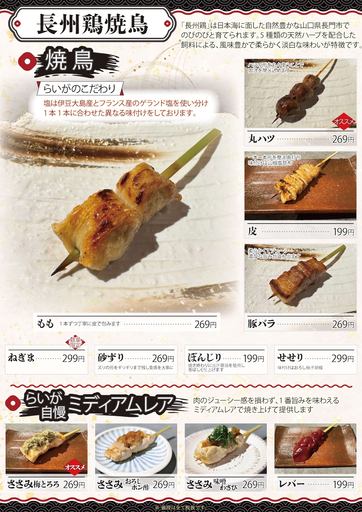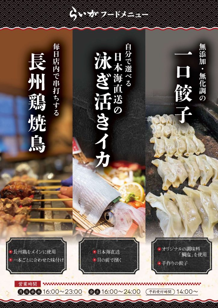 | 店名 | 長州鶏焼鳥 泳ぎ活きイカ 手作り餃子 らいが |