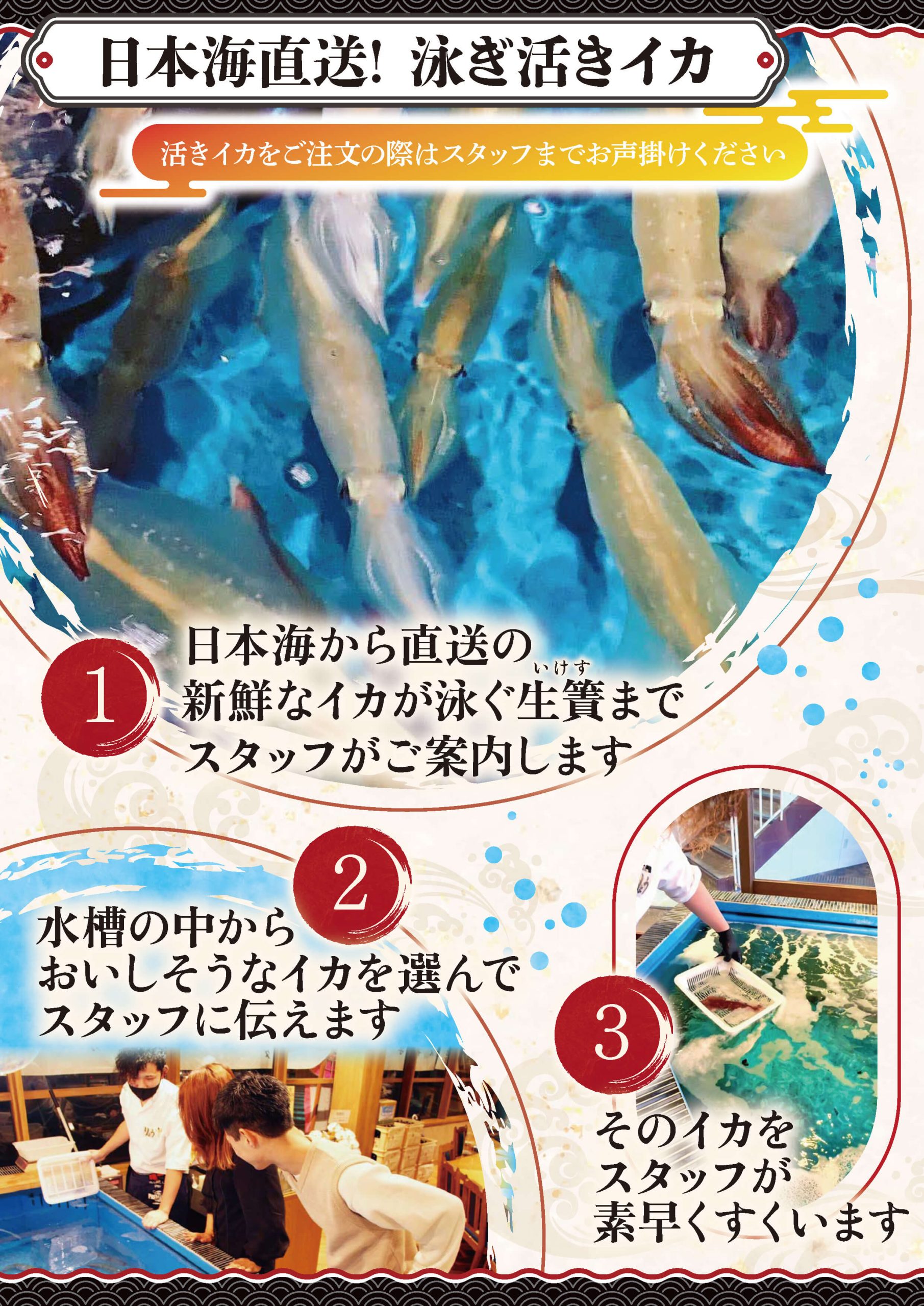 お客様自ら水槽から選び、目の前で捌く日本海直送の泳ぎ活きイカ、