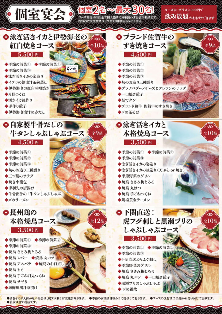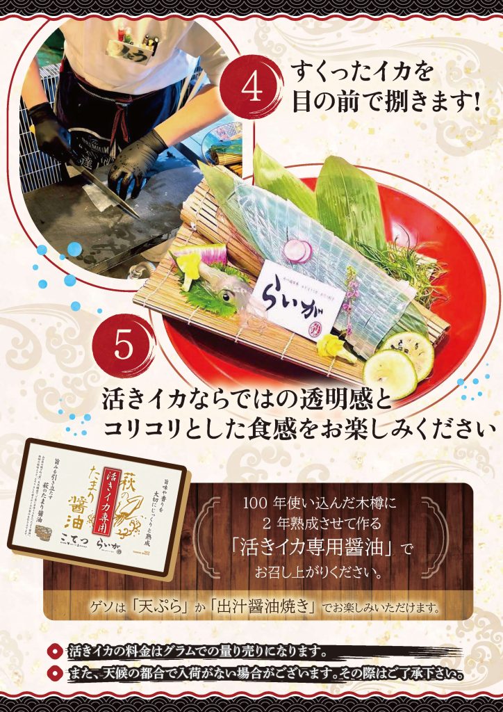 ※泳ぎ活きイカの入荷が無い場合は「虎ふぐ刺し」「黒瀨ブリのしゃぶしゃぶ」になります。